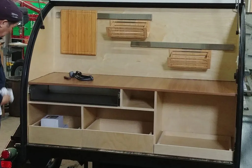 Once the lighting and electronics are installed and thoroughly tested, we insulate the walls and ceiling with one inch thick DuroFoam insulation. In-body ventilation is coated to protect against rot and mold. All kitchen and interior cabinetry is created with white birch, rustic hardware, soft-closing drawers as well as a stainless steel food-grade drawer for a portable propane stove.